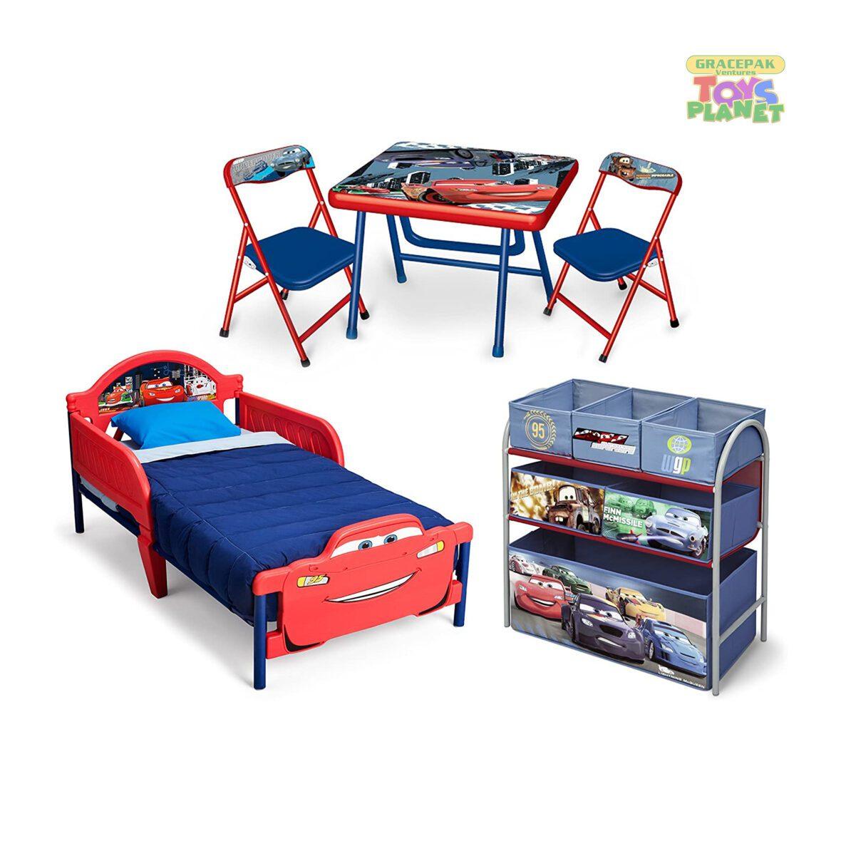 Our Pixar Cars Bedroom Set (Bed, Table & Chair Set, Storage) is a complete set for your child’s bedroom with a Disney cars theme. Set consisting of plastic and metal cot with shaped headboard, multi-purpose toy storage rack and a table plus 2 metal chairs.