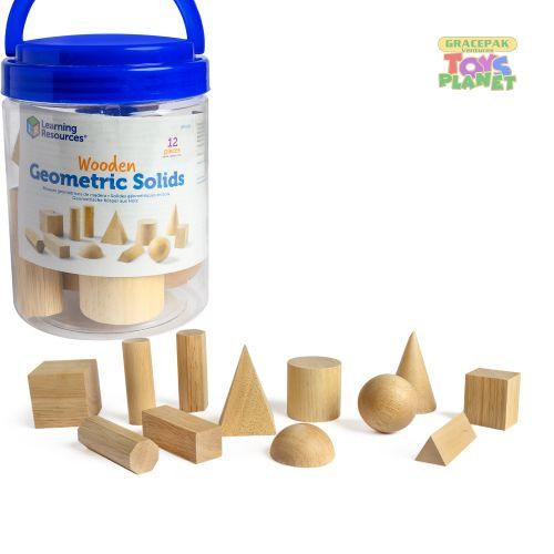 Learning Resources Wood Geometric Solids make it easy to teach shapes, sizes and relationships. Set of 13 shapes includes cone, sphere, cube, cylinders, pyramid, prisms, hemisphere, and rectangular solids. Learning Resources Wood Geometric Solids - Set of 13 Features: 13 smooth, solid wooden shapes that measure 2"-3" each Activity GuideFeatures & detailsIntroduce children to the world of geometry with these solid wooden shapesThese solid, smooth 3-dimensional shapes are a pleasing way to explore pattern and volume before working with 2-D representations.Set contains 12 geometric shapes including sphere, 2 cylinders, 2 square prisms, cube, cone, equilateral triangular prism, octagonal prism, hexagonal prism, hemisphere and rectangular solidComes with activity guide and storage jarIdeal for ages 6+