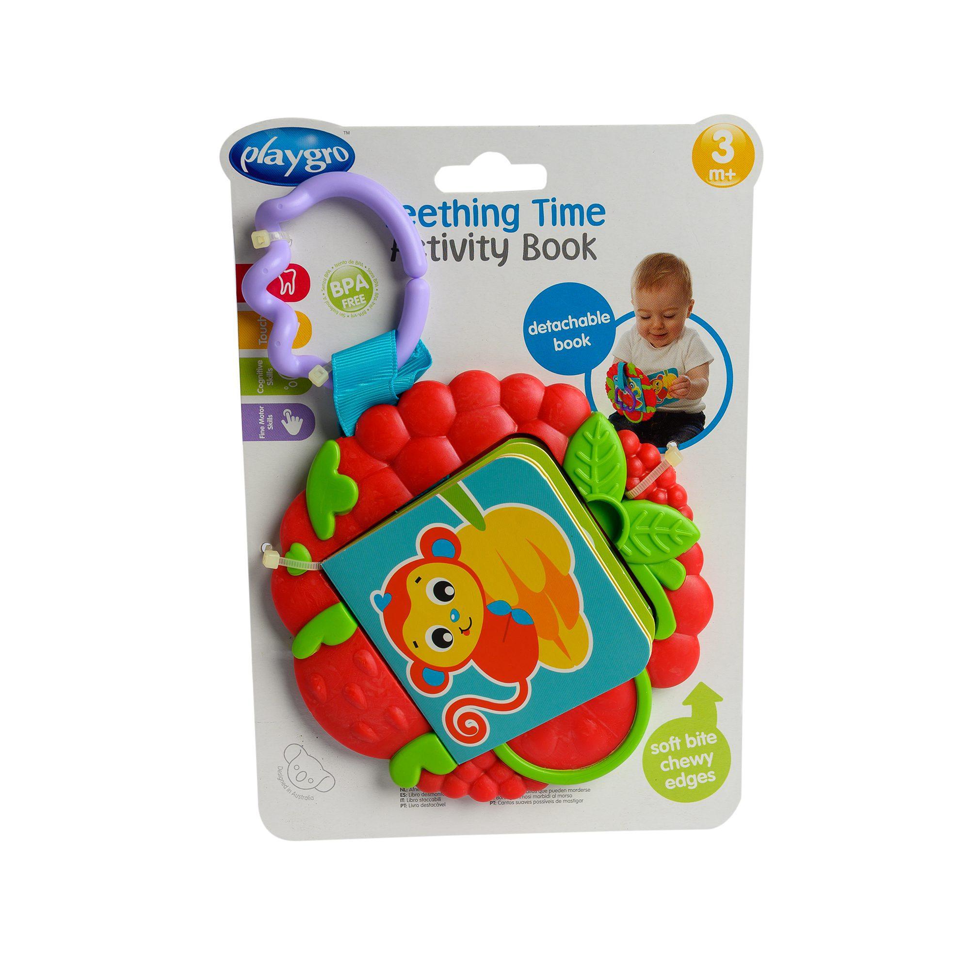 Teething babies will love our kids Playgro Teething Time Activity Book. It features an adorable cloth book with 5 colorful animal illustrations. Each page offers your baby a different sensory experience. One corner of the cover is made of a harder textured material for a great teething experience.