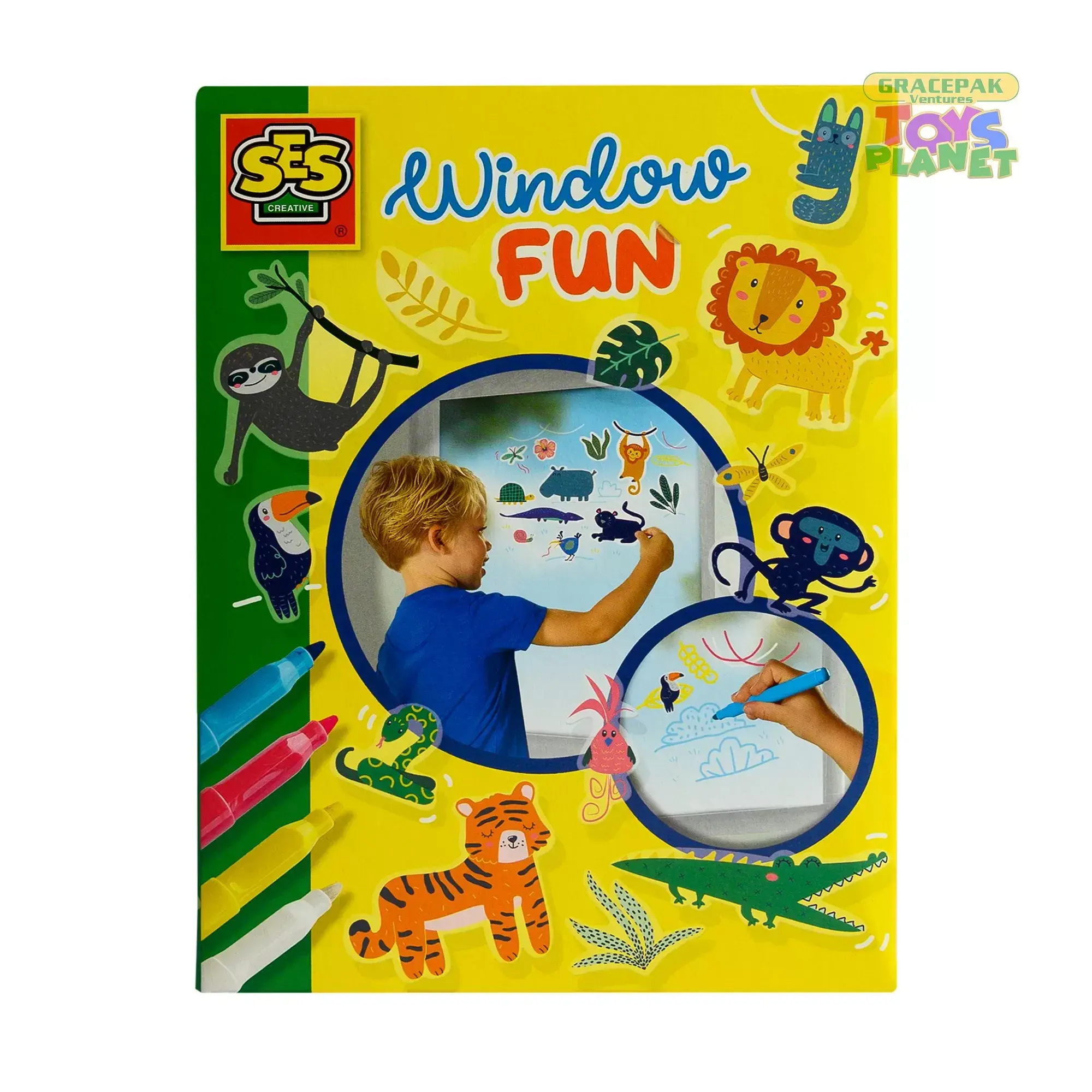 Make your own Jungle scene on a window. In your creation, everything is possible with the many window stickers. Use the 4 colours of glass markers to add drawings, text balloons and more. Let a crocodile talk to a funny looking bird or let a monkey ride on the back of a tiger. It’s up to you.