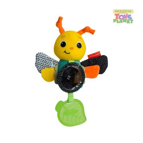 This very nice colourful butterfly has a noise of chime when baby shakes itIts wings crinkleWith a teether leaf ring to nibble and a nice round mirrorThe fabric strap on its head, with hook and loop fastener allow to hang it everywhere
