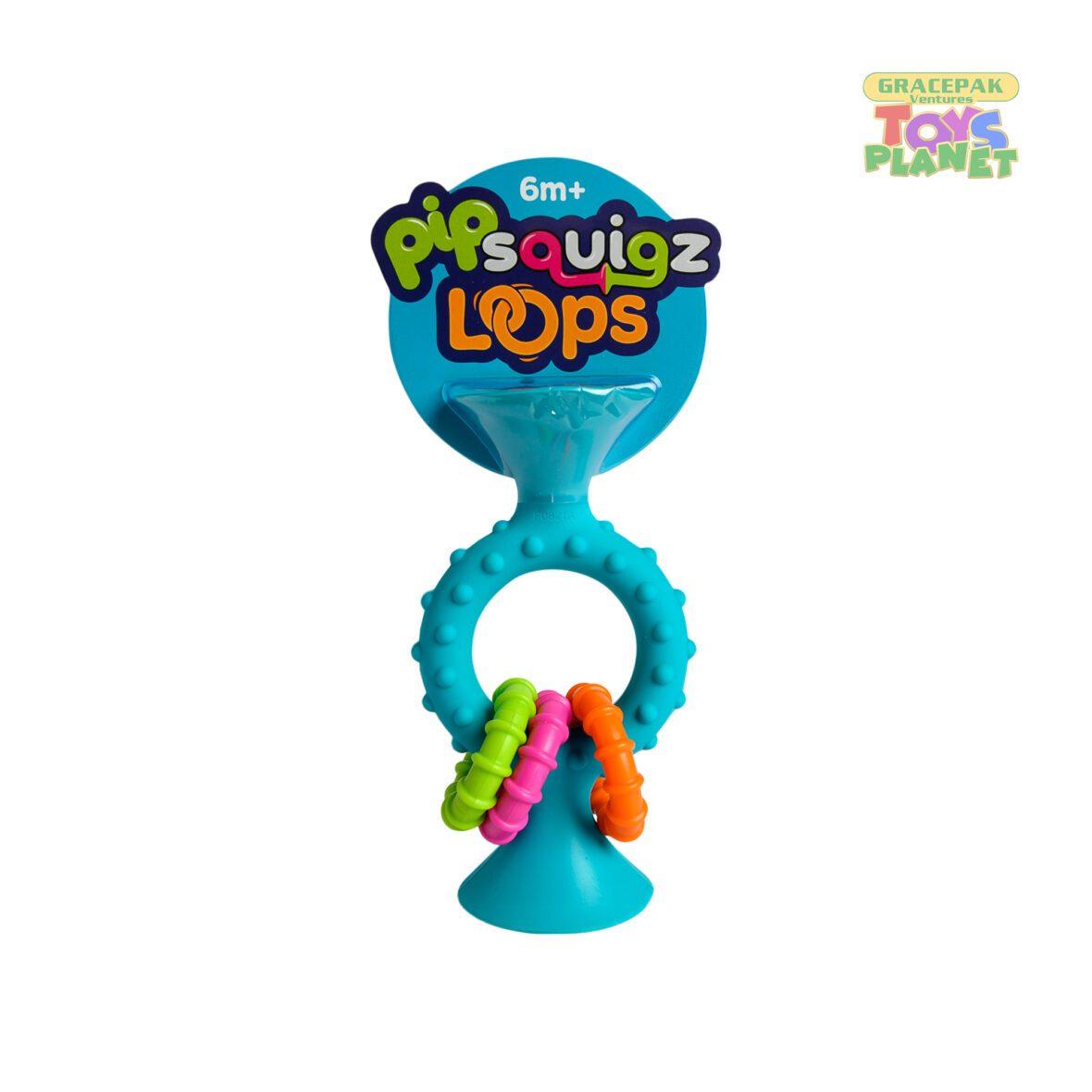 The Fat Brain pipSquigz Loops 6+Months present your little one sensory excitement with the bendy, rattly, chewy, suction-cup creations! Their vivid textures instantly inspire little fingers to grab and feel while their soft silicone material simultaneously makes them perfect for soothing sore gums. Flip and spin the textured, plastic rings to hear them rattle brightly. Press their suction cups onto any smooth, non-porous surface to set up a stationary play space and then pull them off to hear their loud and exciting POP. They’re sure to become baby’s new favorite toy! No matter which one you choose, early playtime learning really sticks when little ones start exploring with the pipSquigz Loops.