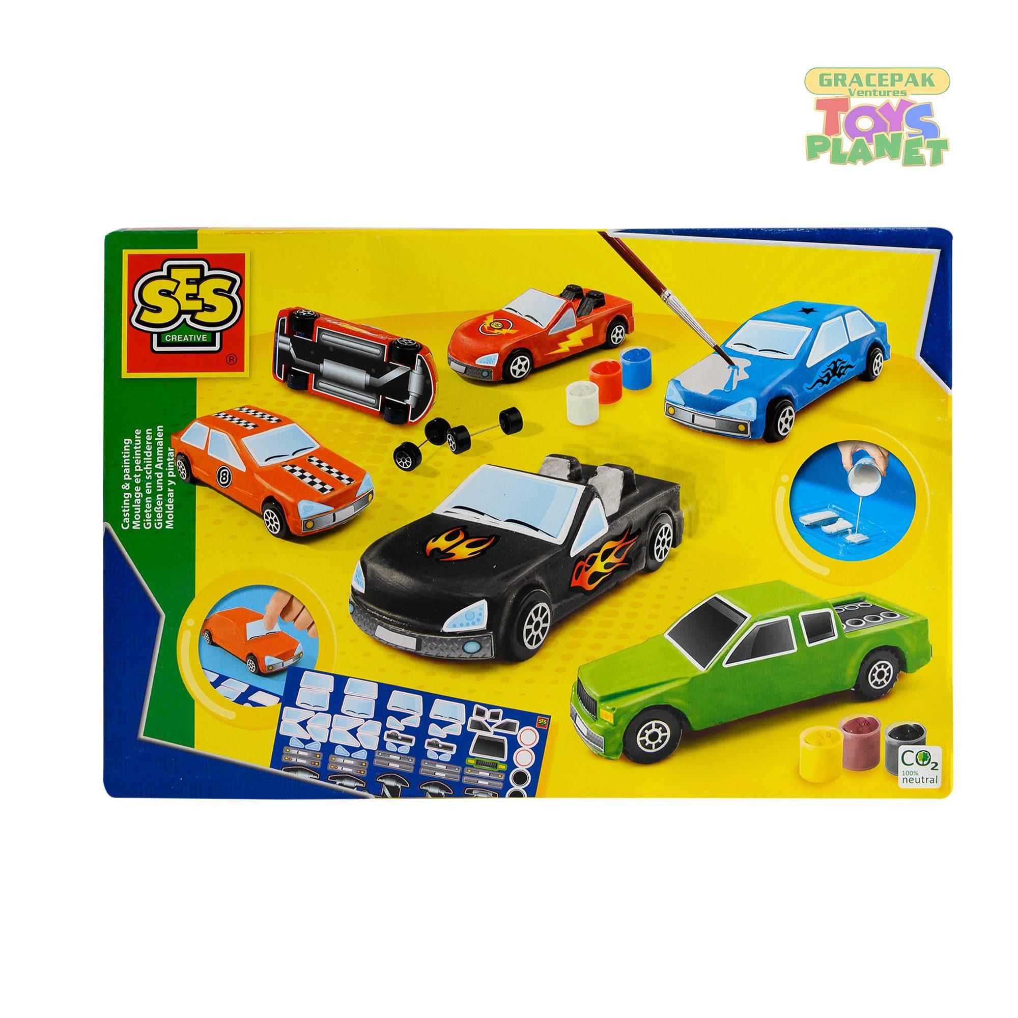 With this casting and painting set from SES Creative, you can make your own cars. Pour the plaster into the 3D mold. Let the model dry and paint your cars with the paint included in the set. Then add glitter and your cars will be complete. Encourages creativity and imagination. Make a 3D cars from plaster A detailed mold that can be used several times Quick-drying plaster Includes enough plaster for two models With glitter The thick paint and plaster are easy to wash off surfaces and out of textiles Stimulates creativity